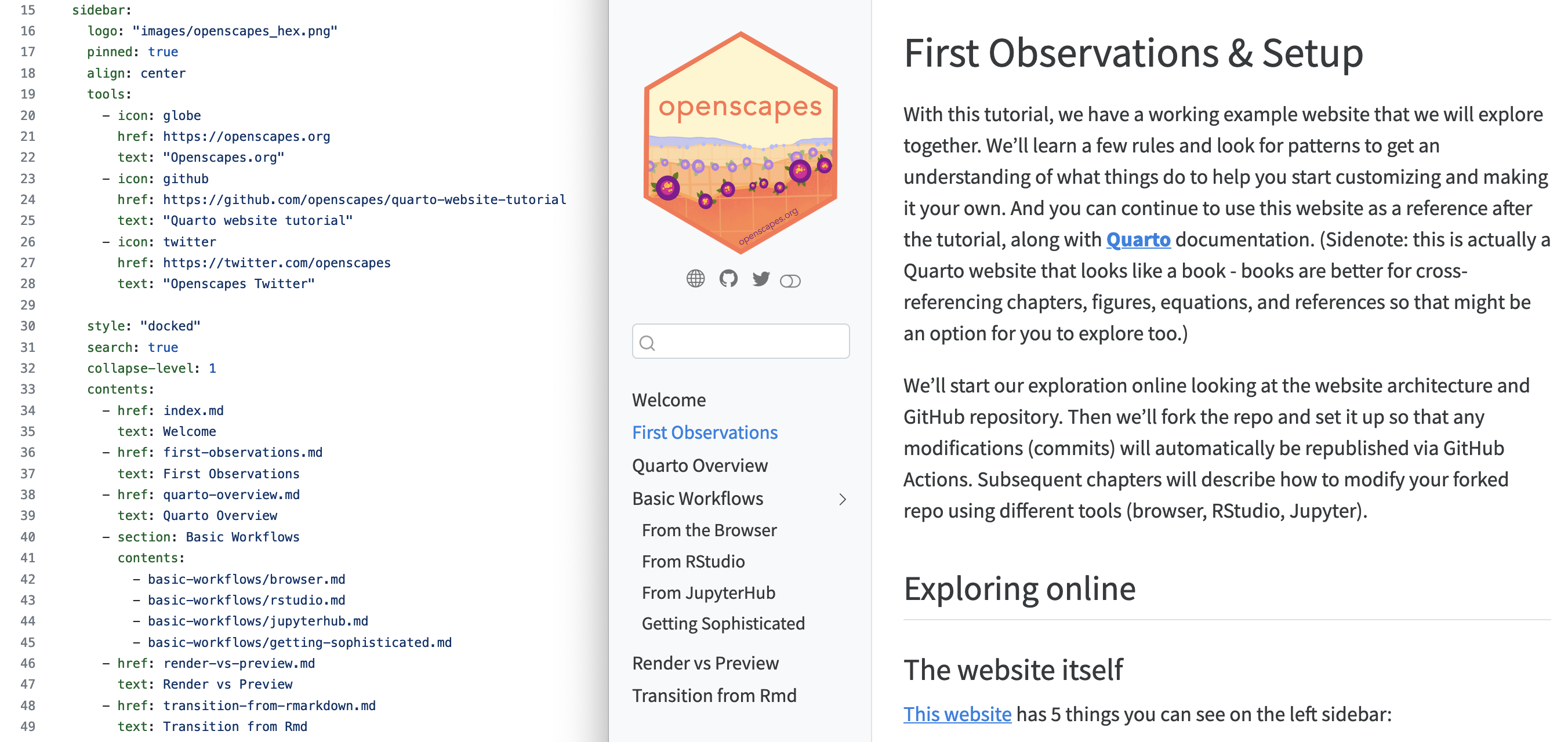_quarto.yml and website side-by-sideNotice that there are multiple ways in the _quarto.yml for you to include a file in your website. For example, in the above image, the “First Observations” we see in the left sidebar of the published website (right image) is represented in _quarto.yml (left image) over two lines, with line 36 indicating the file reference and line 37 indicating the text to show up in the left sidebar. However, “From RStudio” is only represented in one line of _quarto.yml, on line 43. This represents two strategies for including a file in your website. By default, the title of a specified file will show up in the website’s sidebar, which is what is happening with the “From RStudio” example. If you would like more control over what is written in the sidebar vs the title of your files, then the approach we took with “First Observations” is what you’ll want to do: you’ll see that only “First Observations” shows up in the sidebar as we specified in _quarto.yml, but the page’s title says “First Observations & Setup” (which in our preference was too long for the sidebar).